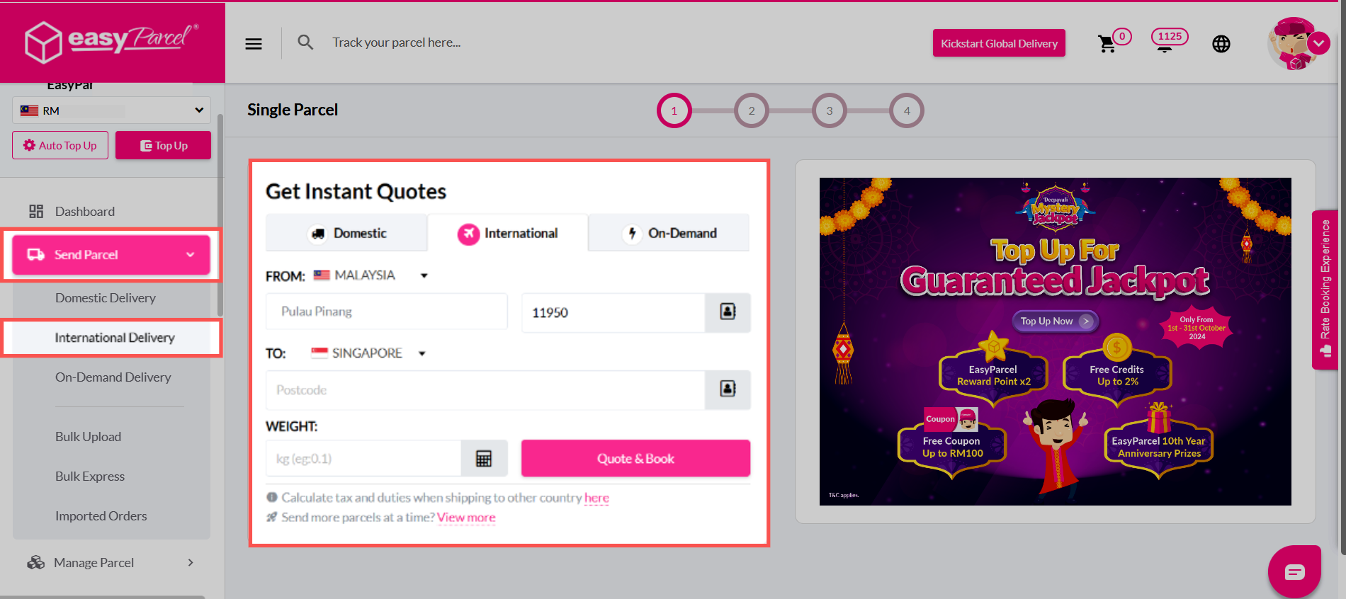 Step 1: Log in to your account, go to "Send Parcel", click " International Delivery". Quote your parcel and book.